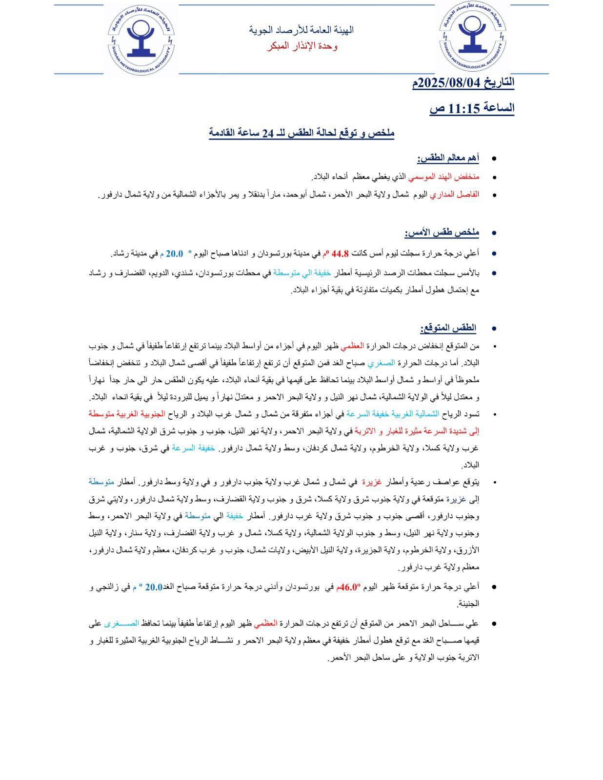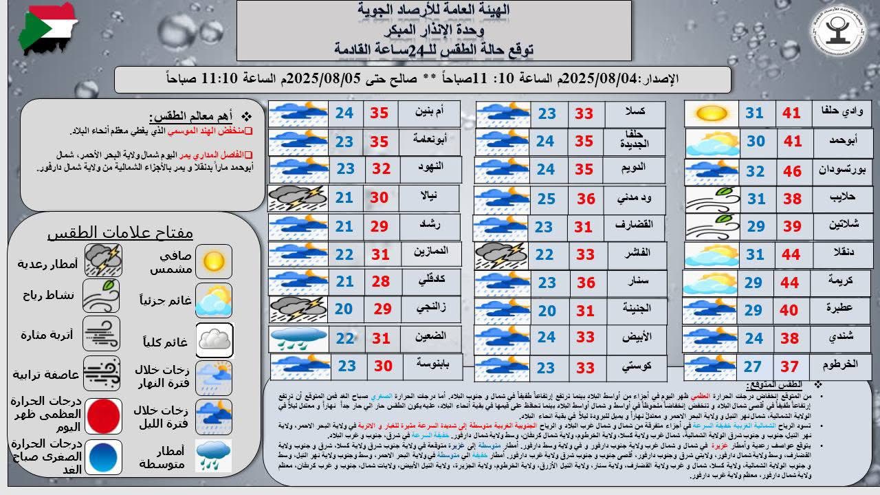 بورتسودان 4-8-2025 (سونا)- توقعت الهيئة العامة للأرصاد الجوية انخفاض الحرارة العظمى في أواسط البلاد وارتفاع طفيف في الشمال والجنوب، مع انخفاض ملحوظ للصغرى بالأواسط