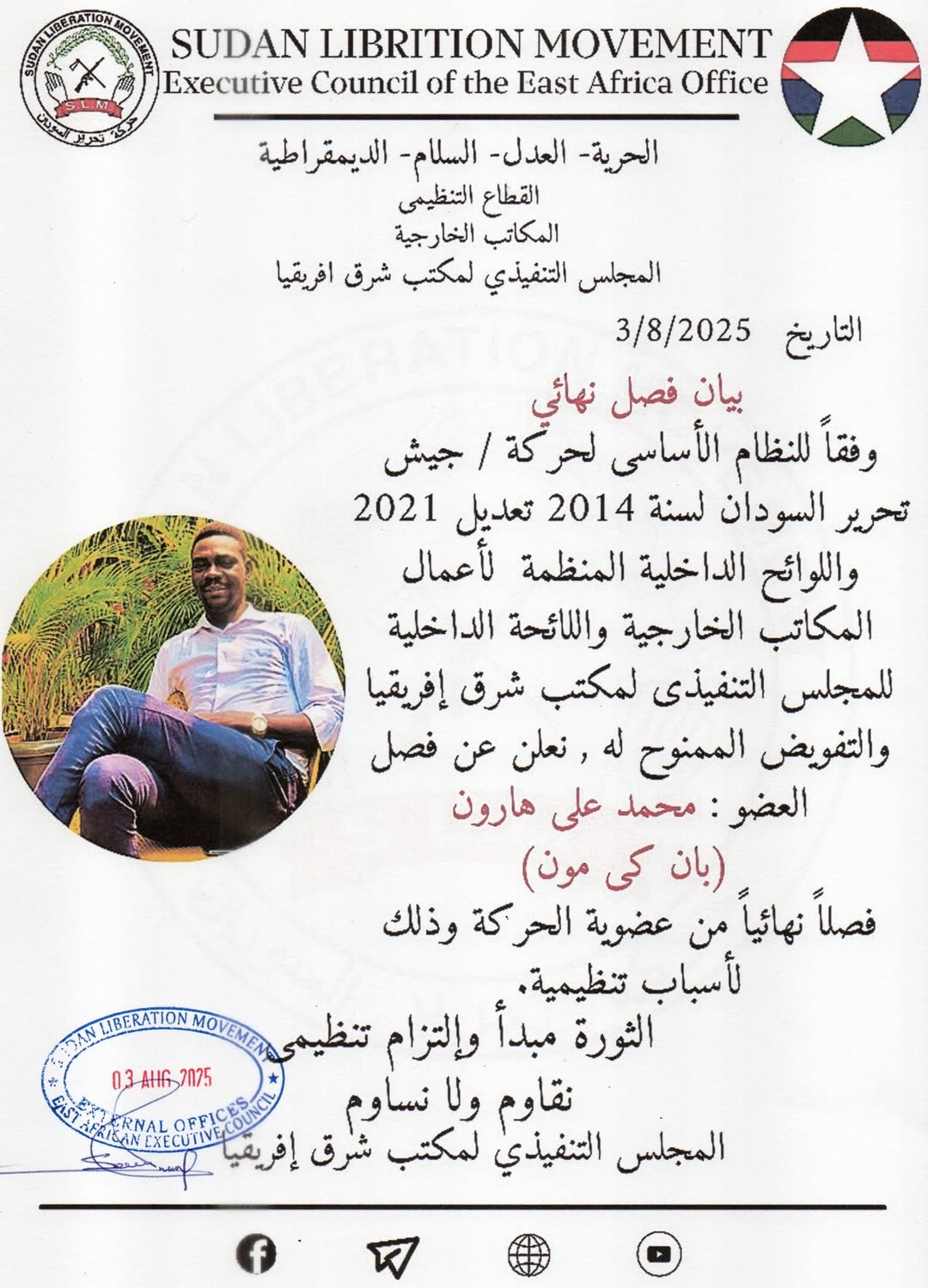 حركة جيش تحرير السودان بيان فصل نهائي من عضوية حركة/ جيش تحرير السودان By null Published August 4, 2025 Share SHARE Facebook Twitter Pinterest LinkedIn[ad_1] بيان فصل نهائي من عضوية حركة/ جيش تحرير السودان [ad_2] Source Facebook Twitter Pinterest LinkedIn Share This Article Facebook Twitter Email Print Previous Article دا إعلام حربي عديل، يجتهد في نقل كل ما يخدم الحرب النفسية للعدو، ويبرر جرائم حصا… Next Article \u0644\u0645\u0629 \u0646\u0641\u0627\u062c”},”is_text_only_story”:false,”id”:”U… Leave a Comment Leave a Reply Cancel replyYour email address will not be published. Required fields are marked *Comment * Name * Email * Website Save my name, email, and website in this browser for the next time I comment. Δ SearchSearchRecent Postsأكرمنا الله صباح اليوم الأحد بلقاء إخوةٍ كرام، على ضفة النيل الأزرق، حيث شاي الش… أعلن بنك السودان المركزي في منشور إدارة السياسات رقم (2025/15) رفع الاحتكار عن ا… ندوة بعنوان: القانون الدولي والسيادة الوطنية قراءة في موقف السودان من لجنة تقصي … والي نهر النيل تستقبل وزير الموارد البشرية والرعاية الاجتماعية الوزير يشيد بالأ… كامل ادريس: رئيس اللجنة السياسية لمؤسسات الدولة السودانية. Recent CommentsNo comments to show.