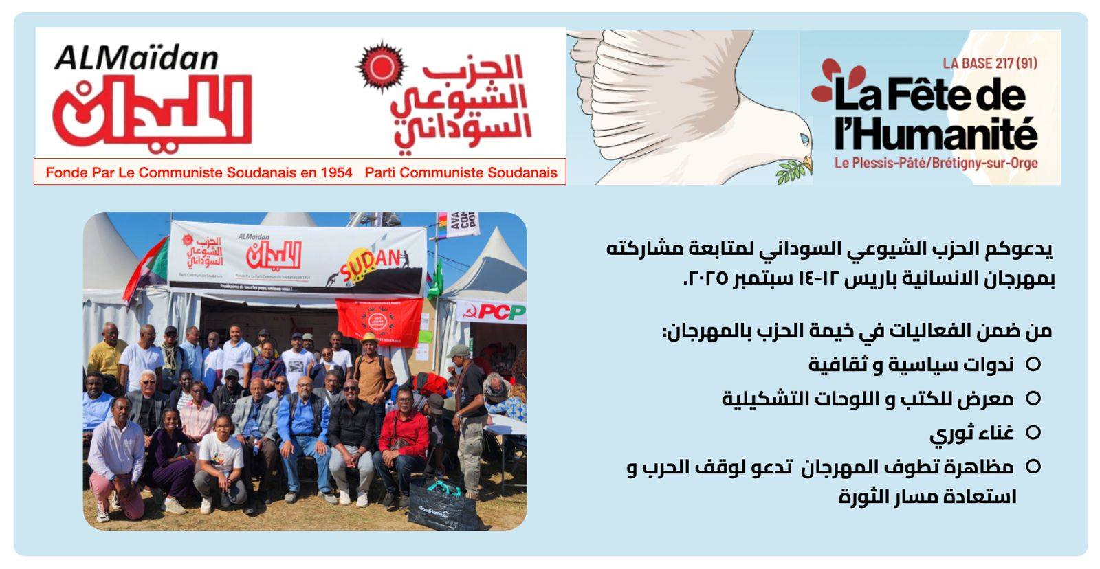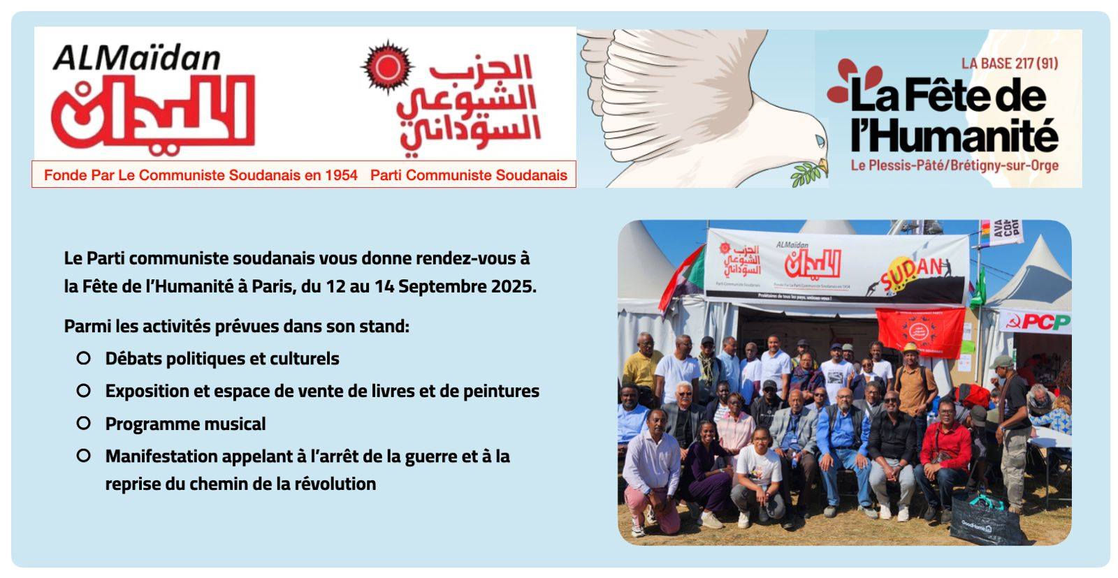 Le Parti communiste soudanais vous donne rendez-vous à la Fête de l’Humanité à Paris, du 12 au 14 Septembre 2025.