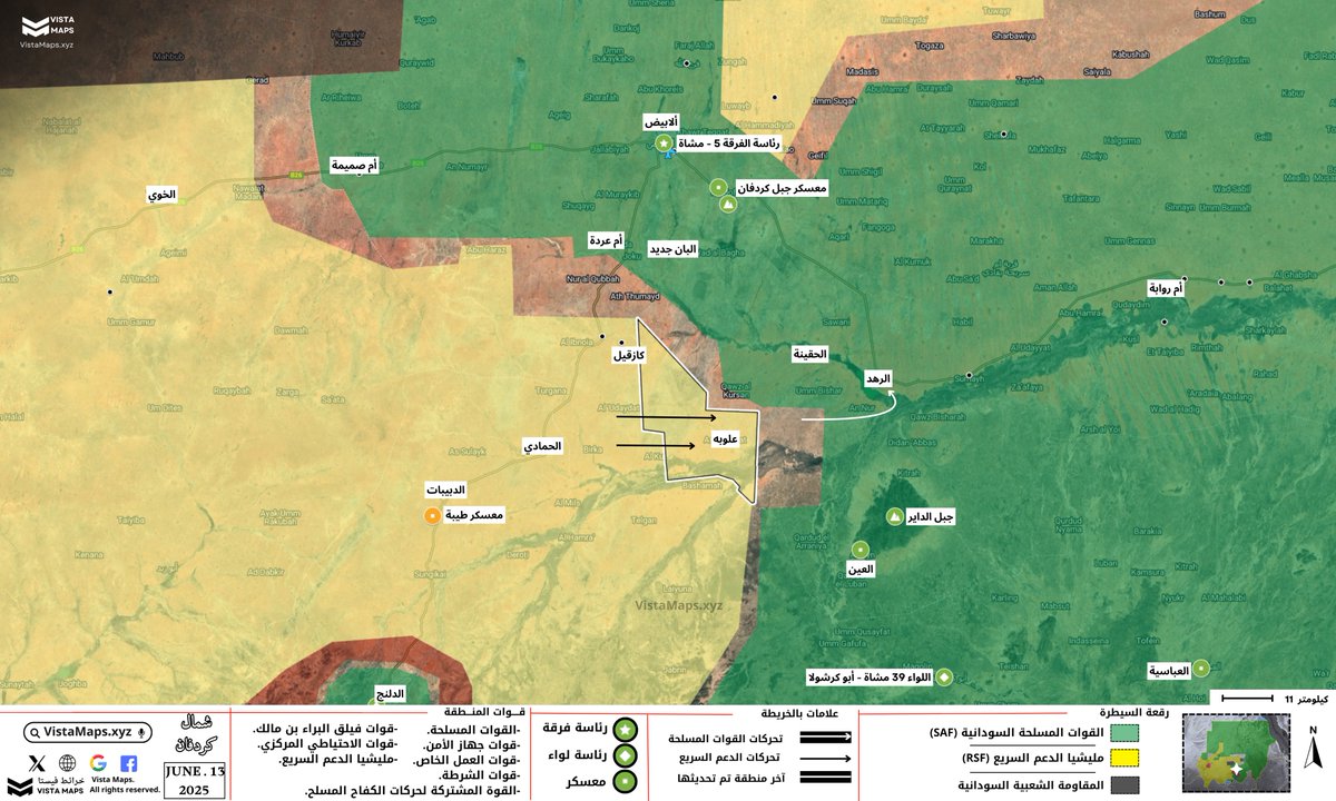 – اقتربت المليشيا من مدينة الرهد وجبل الداير حيث أصبح الطريق المؤدي إلى المنطقتين مفتوحًا ومباشرًا أمامها.