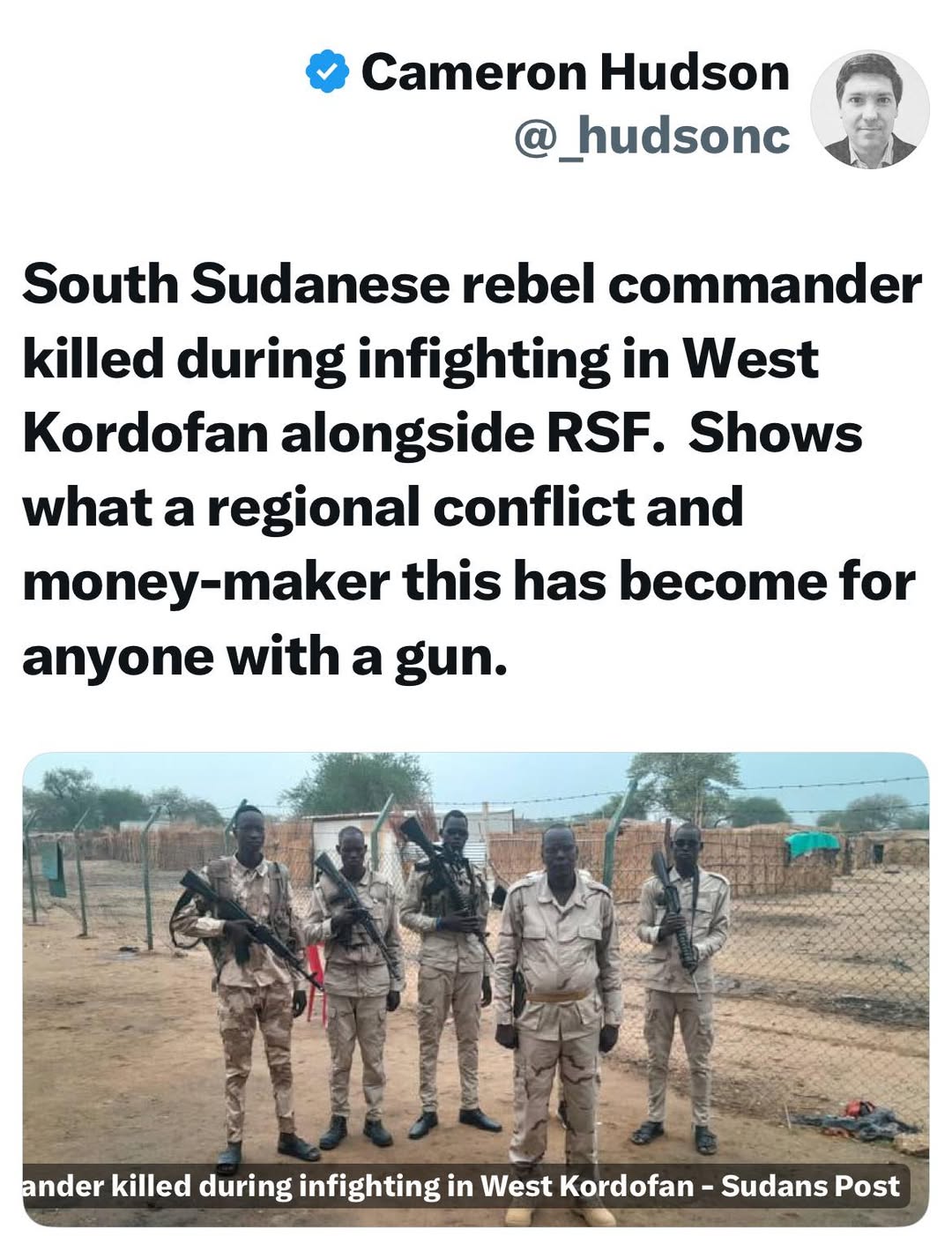 (قُتل قائد متمرد من جنوب السودان خلال اشتباكات داخلية في غرب كردفان إلى جانب قوات الدعم السريع. ويُظهر هذا كيف تحوّل الصراع إلى نزاع إقليمي ومصدر للربح لكل من يحمل السلاح).