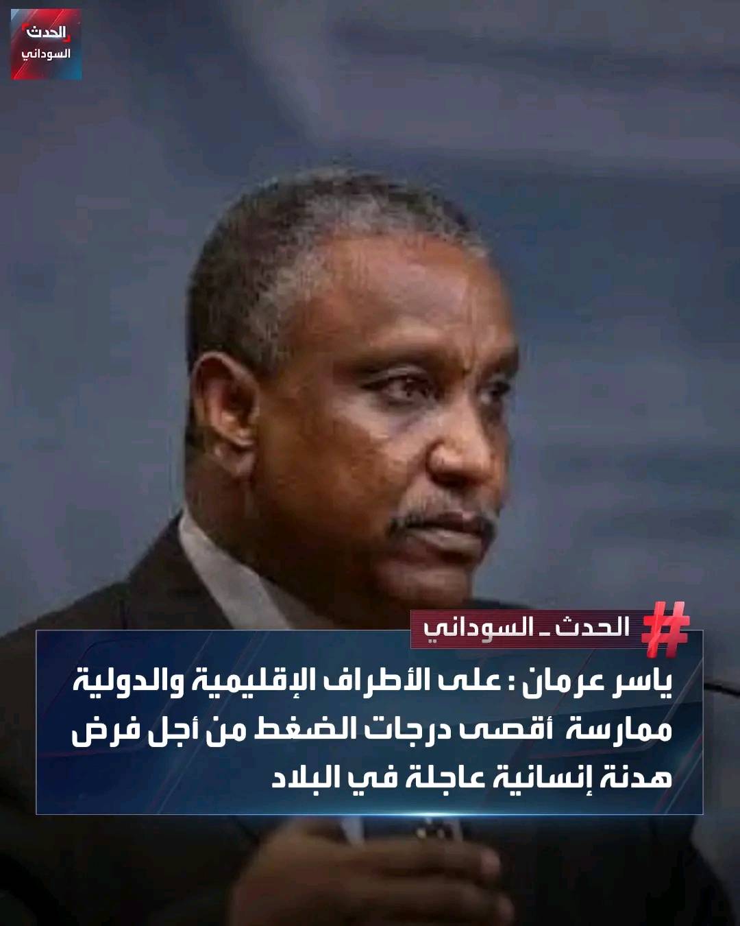 وأضاف عرمان في تغريدة على منصة إكس “لذا يتوجب على الأطراف الإقليمية والدولية ممارسة أقصى درجات الضغط من أجل فرض هدنة إنسانية عاجلة، والسماح بإيصال المساعدات الإنسانية، وخاصة الغذاء والدواء إلى جميع المناطق دون استثناء”.