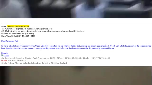 أثمرت هذه الجهود عن إقامة أول ورشة تدريبية من قبل شركة اوراكل في السودان لصالح معلمي المرحلة الثانوية من المدارس الحكومية والخاصة في نوفمبر 2007م.