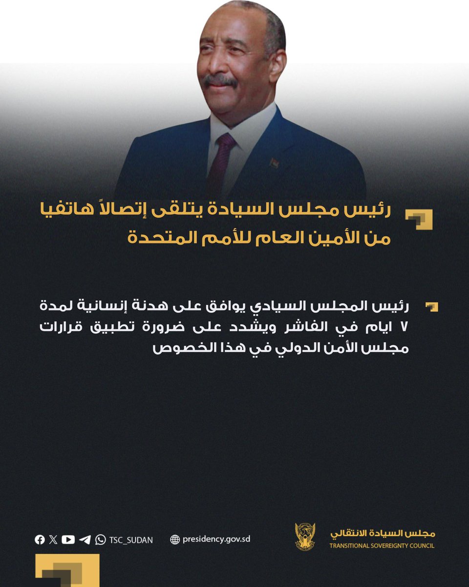 مجلس السيادة رئيس مجلس السيادة يتلقى إتصالاً هاتفياً من الأمين العام للأمم المتحدة … By null Published August 8, 2025 Share SHARE Facebook Twitter Pinterest LinkedIn[ad_1] ⭕️ رئيس مجلس السيادة يتلقى إتصالاً هاتفياً من الأمين العام للأمم المتحدة [ad_2] Source by مجلس السيادة الإنتقالي – السودان Facebook Twitter Pinterest LinkedIn Share This Article Facebook Twitter Email Print Previous Article and curricula, promoting social justice and reflecting the status of the state a… Next Article قامت قوة من المشتركة بالقبض على كتيبة تتبع للتيار السلفي المدخلي في منطقة صحراوي… Leave a Comment Leave a Reply Cancel replyYour email address will not be published. Required fields are marked *Comment * Name * Email * Website Save my name, email, and website in this browser for the next time I comment. Δ SearchSearchRecent Postsأكرمنا الله صباح اليوم الأحد بلقاء إخوةٍ كرام، على ضفة النيل الأزرق، حيث شاي الش… أعلن بنك السودان المركزي في منشور إدارة السياسات رقم (2025/15) رفع الاحتكار عن ا… ندوة بعنوان: القانون الدولي والسيادة الوطنية قراءة في موقف السودان من لجنة تقصي … والي نهر النيل تستقبل وزير الموارد البشرية والرعاية الاجتماعية الوزير يشيد بالأ… كامل ادريس: رئيس اللجنة السياسية لمؤسسات الدولة السودانية. Recent CommentsNo comments to show.