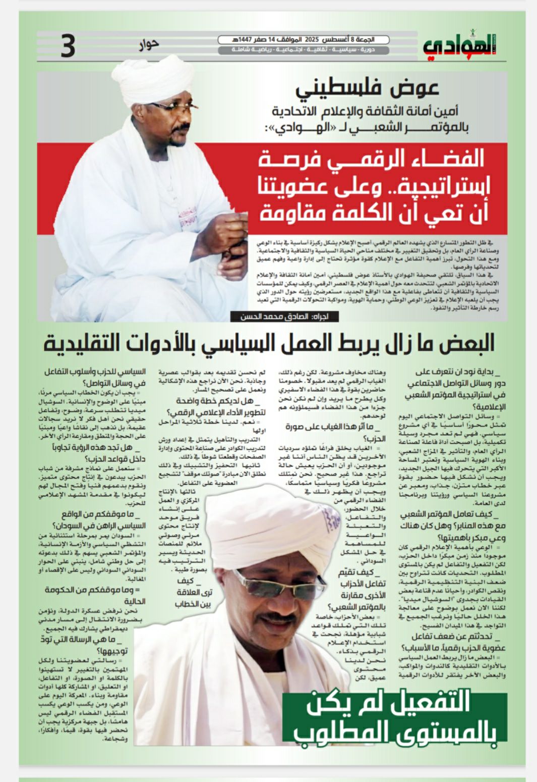 في هذا السياق، تلتقي صحيفة الهوادي بالأستاذ عوض فلسطيني، أمين أمانة الثقافة والإعلام الاتحادية بالمؤتمر الشعبي، لتتحدث معه حول أهمية الإعلام في العصر الرقمي، وكيف يمكن للمؤسسات السياسية والثقافية أن تتعاطى بفاعلية مع هذا الواقع الجديد، مستعرضين رؤيته حول الدور الذي يجب أن يلعبه الإعلام في تعزيز الوعي الوطني، وحماية الهوية، ومواكبة التحولات الرقمية التي تعيد رسم خارطة التأثير والنفوذ.