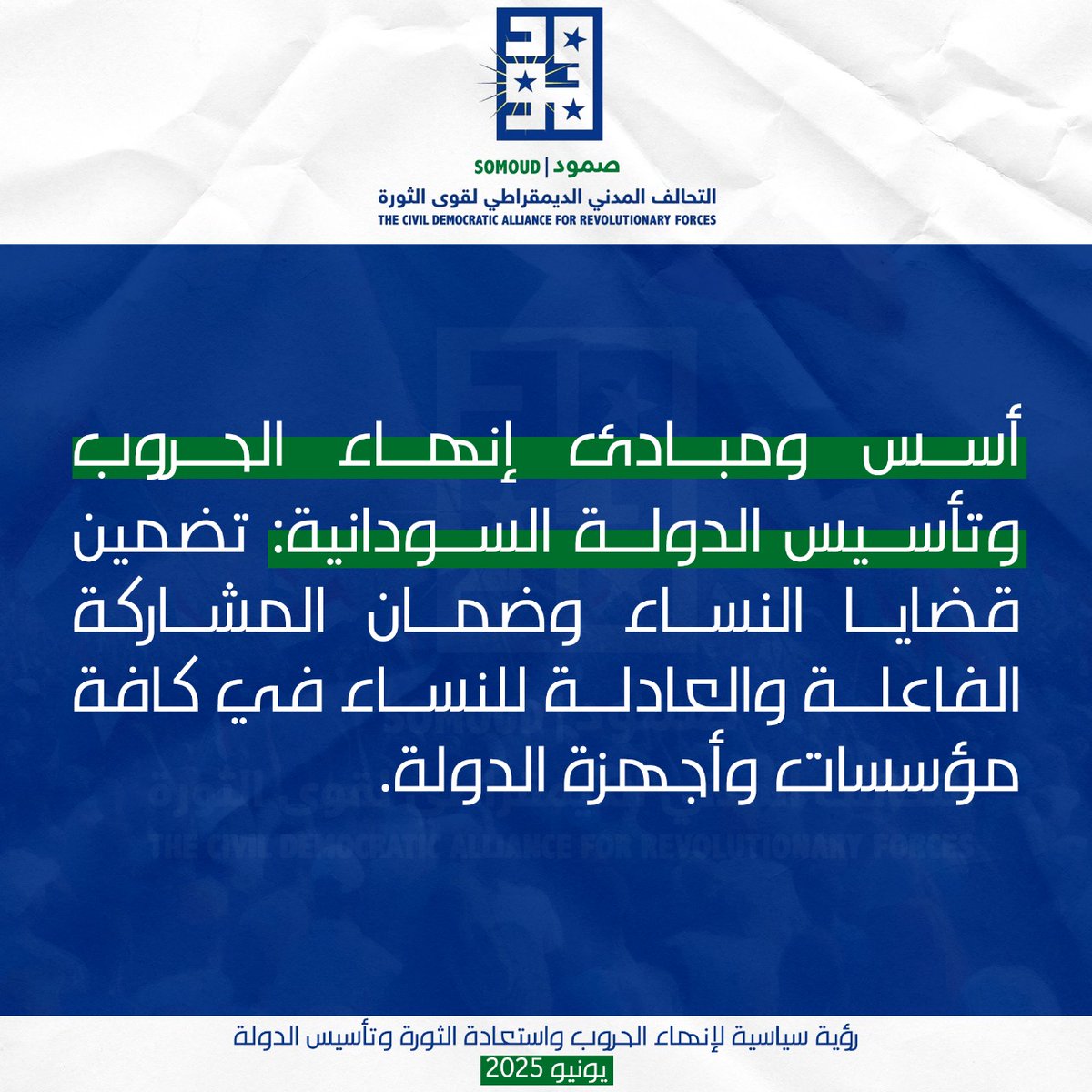 أسس ومبادئ إنهاء الحروب وتأسيس الدولة السودانية: تضمين قضايا النساء وضمان المشاركة الفاعلة والعادلة للنساء في كافة مؤسسات وأجهزة الدولة.