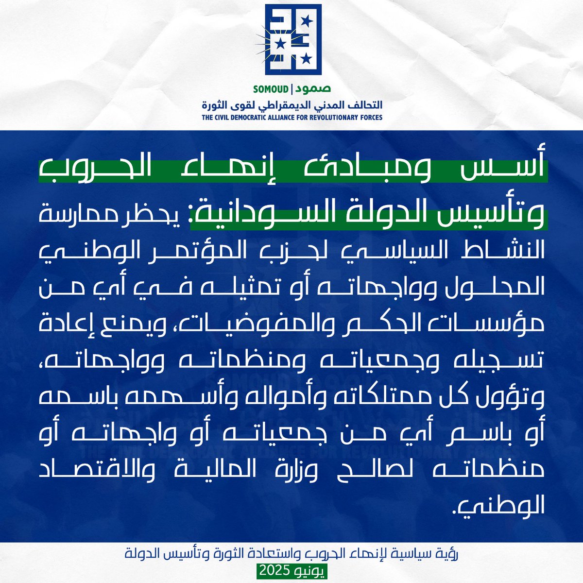 أسس ومبادئ إنهاء الحروب وتأسيس الدولة السودانية: يحظر ممارسة النشاط السياسي لحزب المؤتمر الوطني المحلول وواجهاته أو تمثيله في أي من مؤسسات الحكم والمفوضيات، ويمنع إعادة تسجيله وجمعياته ومنظماته وواجهاته، وتؤول كل ممتلكاته وأمواله وأسهمه باسمه أو باسم أي من جمعياته أو واجهاته أو منظماته لصالح وزارة المالية والاقتصاد الوطني.