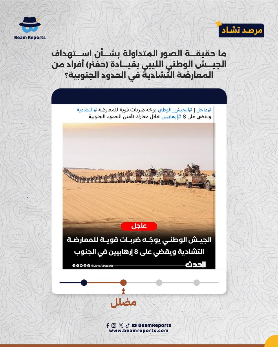 الصور قديمة، إذ تأكد فريق المرصد بأن الصور المصاحبة للادعاء قديمة ولا صلة لها بالحدث الذي تأكد وقوعه بالفعل، إذ استهدفت قوات خليفة حفتر أفراد من المعارضة التشادية في الحدود الليبية الجنوبية.