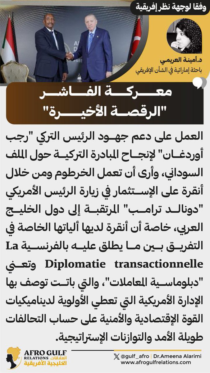 ♦️ سياسياً: العمل على دعم جهود الرئيس التركي “رجب أوردغان” لإنجاح المبادرة التركية حول الملف السوداني، وأرى أن تعمل الخرطوم ومن خلال أنقرة على الإستثمار في زيارة الرئيس الأمريكي “دونالد ترامب” المرتقبة إلى دول #الخليج_العربي ، خاصة أن أنقرة لديها ألياتها الخاصة في التفريق بين ما يطلق عليه بالفرنسية “Diplomatie transactionnelle La ” وتعني “دبلوماسية المعاملات”، والتي باتت توصف بها إدارة الرئيس ترامب التي تعطي الأولوية لديناميكيات القوة الإقتصادية والأمنية على حساب التحالفات طويلة الأمد والتوازنات الإستراتيجية.