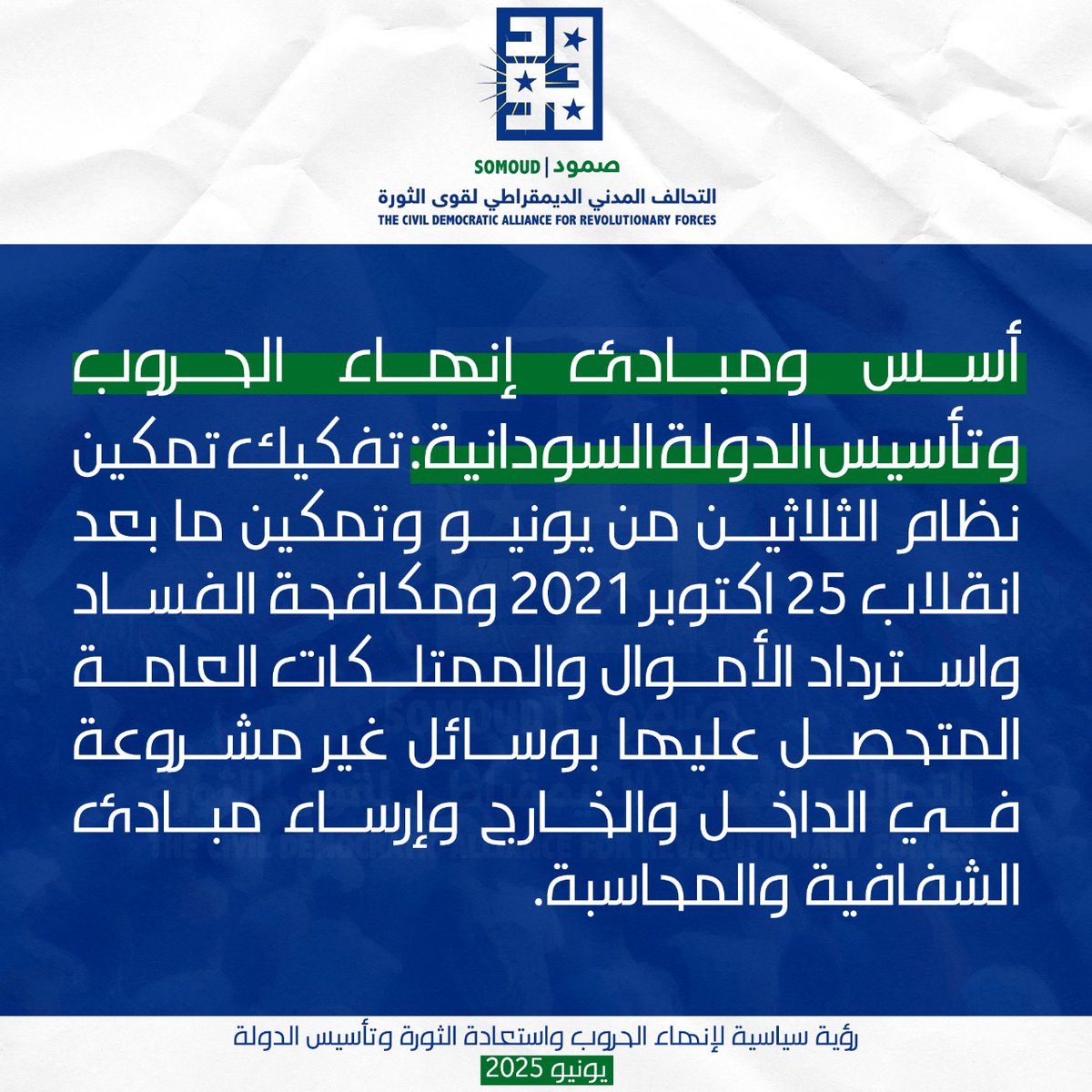 أسس ومبادئ إنهاء الحروب وتأسيس الدولة السودانية: تفكيك تمكين نظام الثلاثين من يونيو وتمكين ما بعد انقلاب 25 اكتوبر 2021 ومكافحة الفساد واسترداد الأموال والممتلكات العامة المتحصل عليها بوسائل غير مشروعة في الداخل والخارج وإرساء مبادئ الشفافية والمحاسبة.