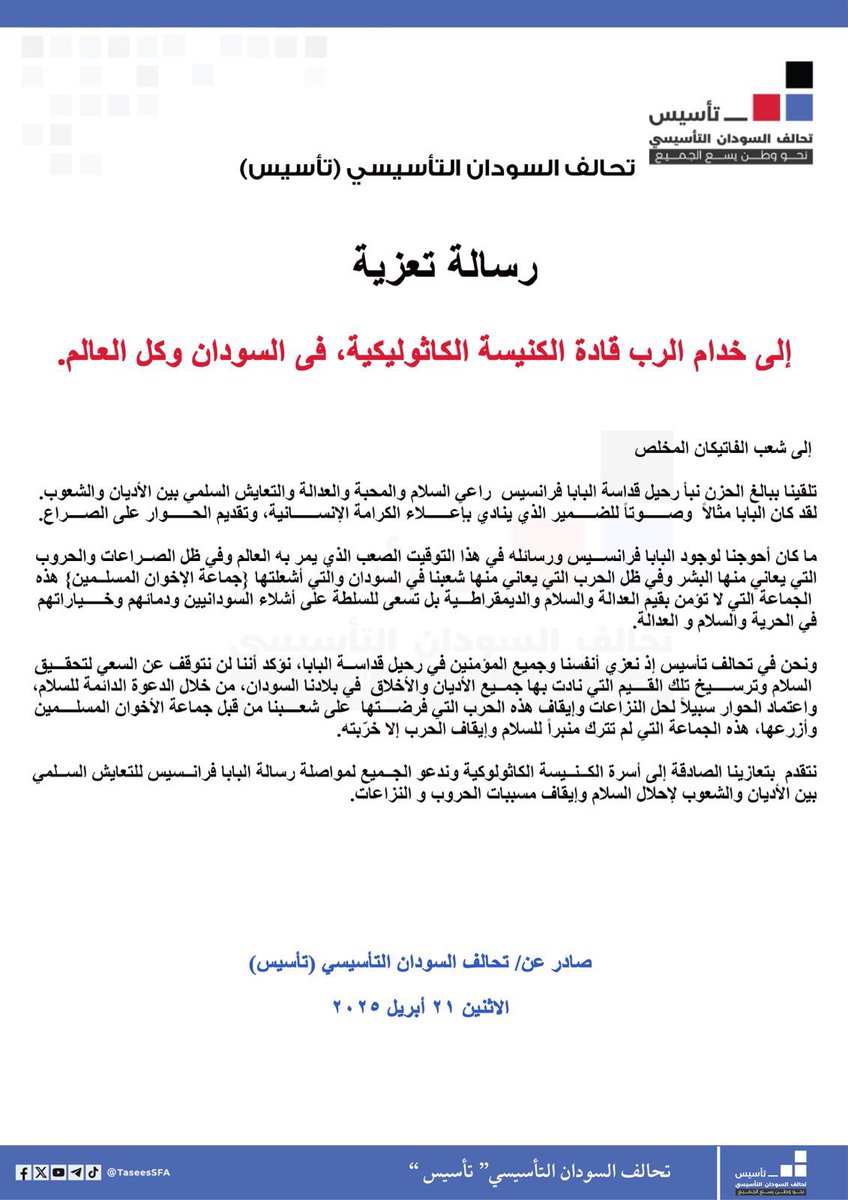 ونحن في تحالف تأسيس إذ نعزي أنفسنا وجميع المؤمنين في رحيل قداسة البابا، نؤكد أننا لن نتوقف عن السعي لتحقيق السلام وترسيخ تلك القيم التي نادت بها جميع الأديان والأخلاق في بلادنا السودان، من خلال الدعوة الدائمة للسلام، واعتماد الحوار سبيلاً لحل النزاعات وإيقاف هذه الحرب التي فرضتها على شعبنا من قبل جماعة الأخوان المسلمين وأزرعها، هذه الجماعة التي لم تترك منبراً للسلام وإيقاف الحرب إلا خرّبته.