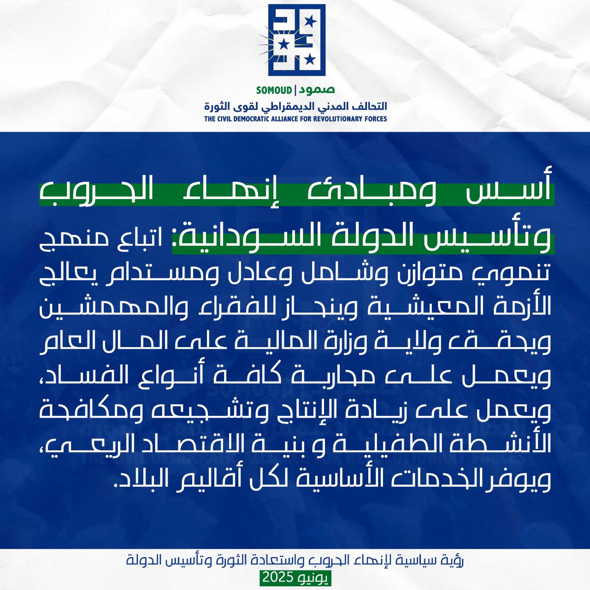 أسس ومبادئ إنهاء الحروب وتأسيس الدولة السودانية: اتباع منهج تنموي متوازن وشامل وعادل ومستدام يعالج الأزمة المعيشية وينحاز للفقراء والمهمشين ويحقق ولاية وزارة المالية على المال العام ويعمل على محاربة كافة أنواع الفساد، ويعمل على زيادة الإنتاج وتشجيعه ومكافحة الأنشطة الطفيلية و بنية الاقتصاد الريعي، ويوفر الخدمات الأساسية لكل أقاليم البلاد.