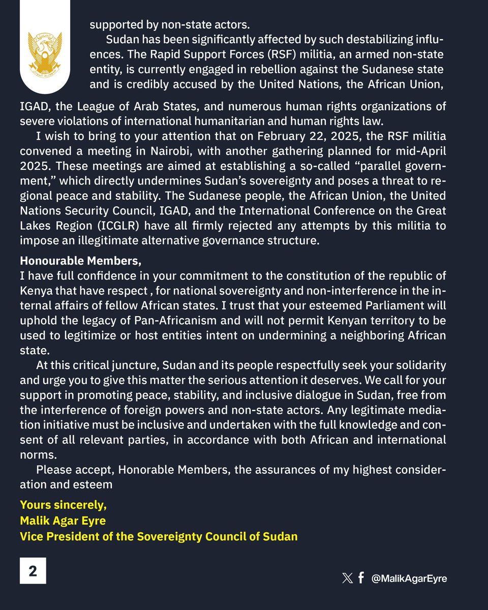 On the Hosting of the Rapid Support Militia meetings in Nairobi, a message was delivered via the @ForeignOfficeKE Kenyan ministry of foreign affairs through the Sudanese ministry of foreign affairs to the Kenyan National Assembly as follows: