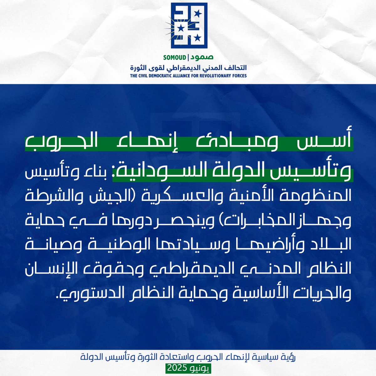أسس ومبادئ إنهاء الحروب وتأسيس الدولة السودانية: بناء وتأسيس المنظومة الأمنية والعسكرية (الجيش والشرطة وجهاز المخابرات) وينحصر دورها في حماية البلاد وأراضيها وسيادتها الوطنية وصيانة النظام المدني الديمقراطي وحقوق الإنسان والحريات الأساسية وحماية النظام الدستوري.