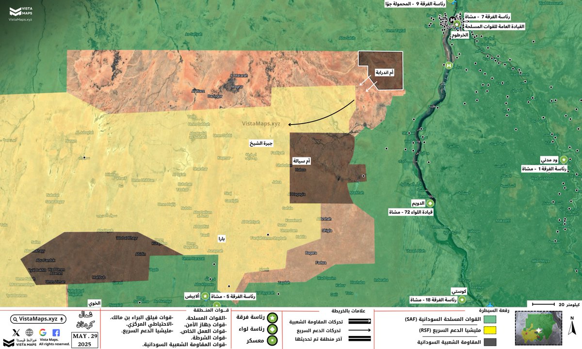 – أعلنت قوات المقاومة الشعبية السودانية (أبناء قبيلة الكبابيش) عن فرض سيطرتهم على منطقة أم أندرابة غرب الخرطوم، وذلك عقب معركة عنيفة استمرت ليومين أسفرت عن هزيمة مليشيا الدعم السريع وطردها من المنطقة.