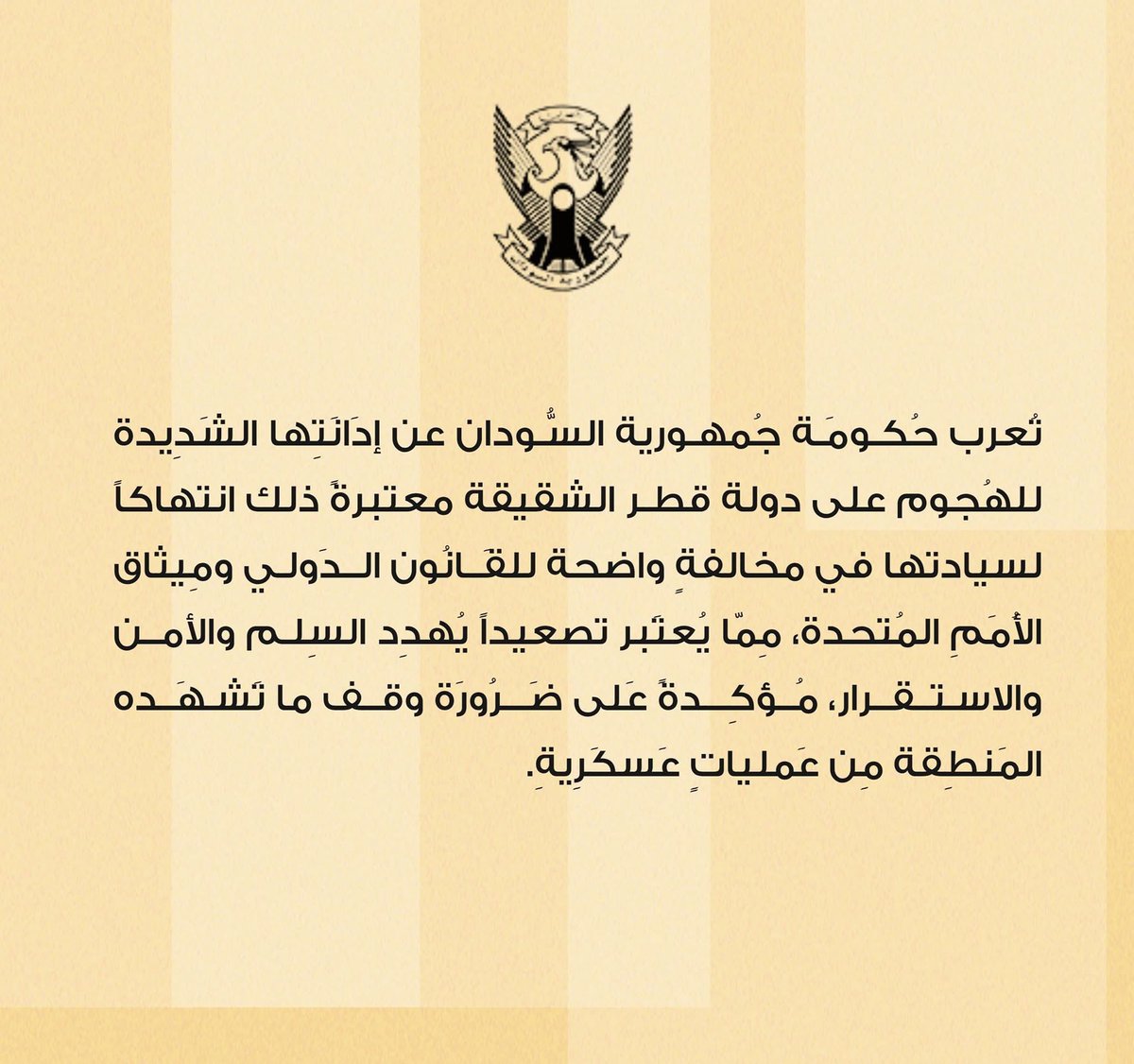 مجلس السيادة السودان يدين الهجوم على قطر ويصفه بانتهاك للسيادة وتصعيد خطير … By null Published August 11, 2025 Share SHARE Facebook Twitter Pinterest LinkedIn[ad_1] ⭕️ السودان يدين الهجوم على قطر ويصفه بانتهاك للسيادة وتصعيد خطير [ad_2] Source by مجلس السيادة الإنتقالي – السودان Facebook Twitter Pinterest LinkedIn Share This Article Facebook Twitter Email Print Previous Article We stand fully prepared to collaborate with all stakeholders to create greater o… Next Article انا اتهنت وانا اتذليت وانا اتدقيت وانا اتعمرت فيني الطبنجة #شبكة_رصد_السودان Leave a Comment Leave a Reply Cancel replyYour email address will not be published. Required fields are marked *Comment * Name * Email * Website Save my name, email, and website in this browser for the next time I comment. Δ SearchSearchRecent Postsأكرمنا الله صباح اليوم الأحد بلقاء إخوةٍ كرام، على ضفة النيل الأزرق، حيث شاي الش… أعلن بنك السودان المركزي في منشور إدارة السياسات رقم (2025/15) رفع الاحتكار عن ا… ندوة بعنوان: القانون الدولي والسيادة الوطنية قراءة في موقف السودان من لجنة تقصي … والي نهر النيل تستقبل وزير الموارد البشرية والرعاية الاجتماعية الوزير يشيد بالأ… كامل ادريس: رئيس اللجنة السياسية لمؤسسات الدولة السودانية. Recent CommentsNo comments to show.