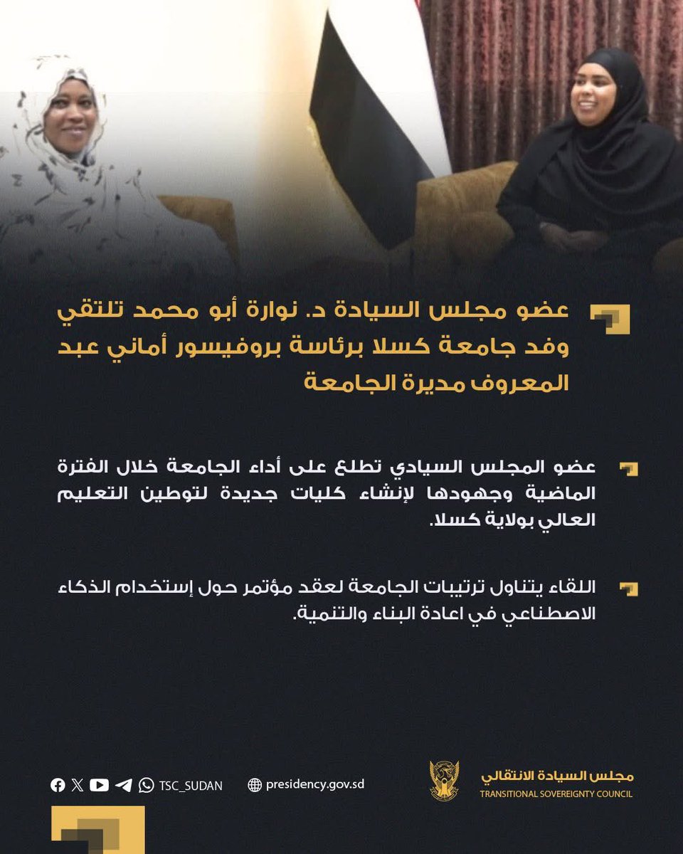 مجلس السيادة عضو مجلس السيادة د. نوارة أبومحمد تلتقي وفد جامعة كسلا برئاسة بروفيسور أماني ع… By null Published August 11, 2025 Share SHARE Facebook Twitter Pinterest LinkedIn[ad_1] ⭕️ عضو مجلس السيادة د. نوارة أبومحمد تلتقي وفد جامعة كسلا برئاسة بروفيسور أماني عبد المعروف مديرة الجامعة بورتسودان ٢٣-٦-٢٠٢٥م [ad_2] Source by مجلس السيادة الإنتقالي – السودان Facebook Twitter Pinterest LinkedIn Share This Article Facebook Twitter Email Print Previous Article while also urging enhanced cooperation to facilitate international organizations… Next Article هذه دولتنا قد أقبلت. #النهر_والبحر … Leave a Comment Leave a Reply Cancel replyYour email address will not be published. Required fields are marked *Comment * Name * Email * Website Save my name, email, and website in this browser for the next time I comment. Δ SearchSearchRecent Postsأكرمنا الله صباح اليوم الأحد بلقاء إخوةٍ كرام، على ضفة النيل الأزرق، حيث شاي الش… أعلن بنك السودان المركزي في منشور إدارة السياسات رقم (2025/15) رفع الاحتكار عن ا… ندوة بعنوان: القانون الدولي والسيادة الوطنية قراءة في موقف السودان من لجنة تقصي … والي نهر النيل تستقبل وزير الموارد البشرية والرعاية الاجتماعية الوزير يشيد بالأ… كامل ادريس: رئيس اللجنة السياسية لمؤسسات الدولة السودانية. Recent CommentsNo comments to show.