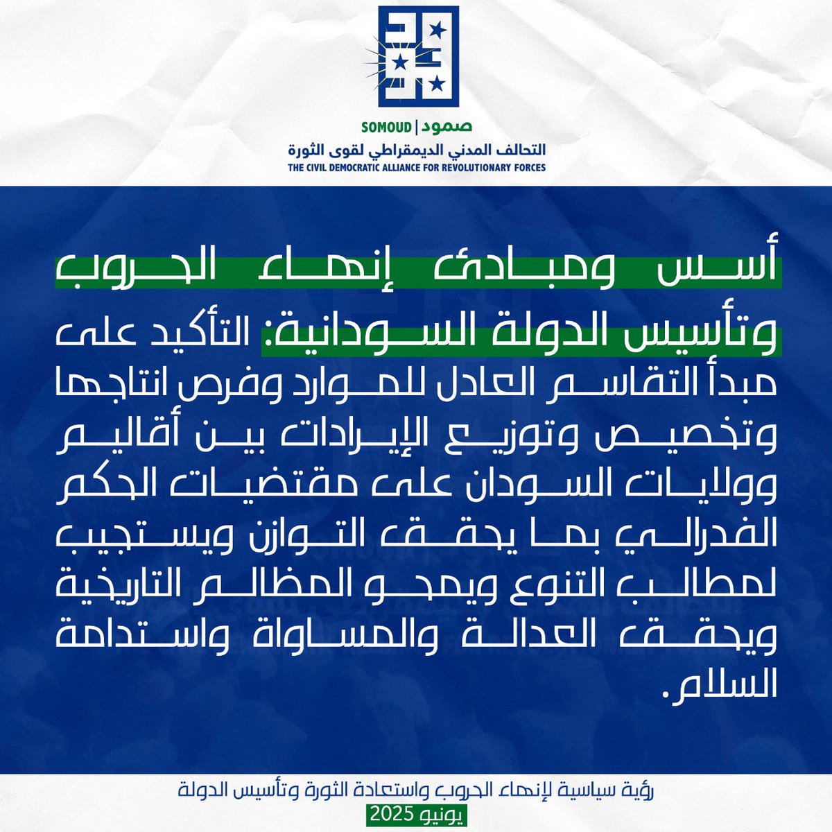 أسس ومبادئ إنهاء الحروب وتأسيس الدولة السودانية: التأكيد على مبدأ التقاسم العادل للموارد وفرص انتاجها وتخصيص وتوزيع الإيرادات بين أقاليم وولايات السودان على مقتضيات الحكم الفدرالي بما يحقق التوازن ويستجيب لمطالب التنوع ويمحو المظالم التاريخية ويحقق العدالة والمساواة واستدامة السلام.