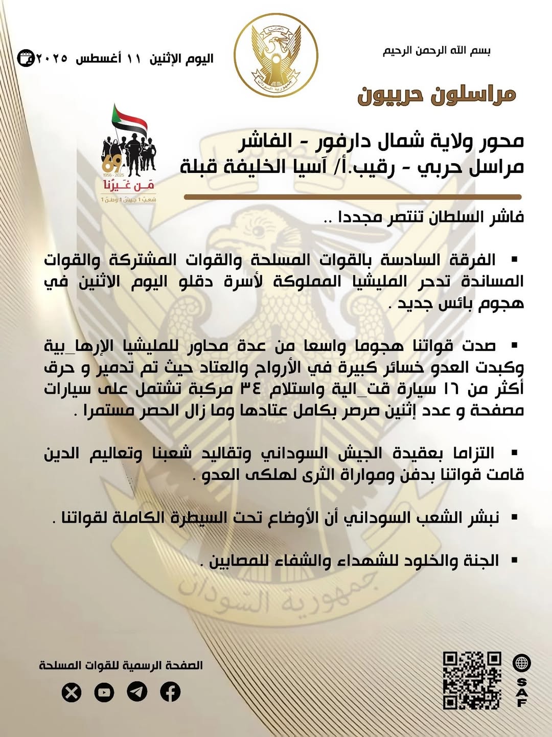 ▪︎ نبشر الشعب السوداني أن الأوضاع تحت السيطرة الكاملة لقواتنا .