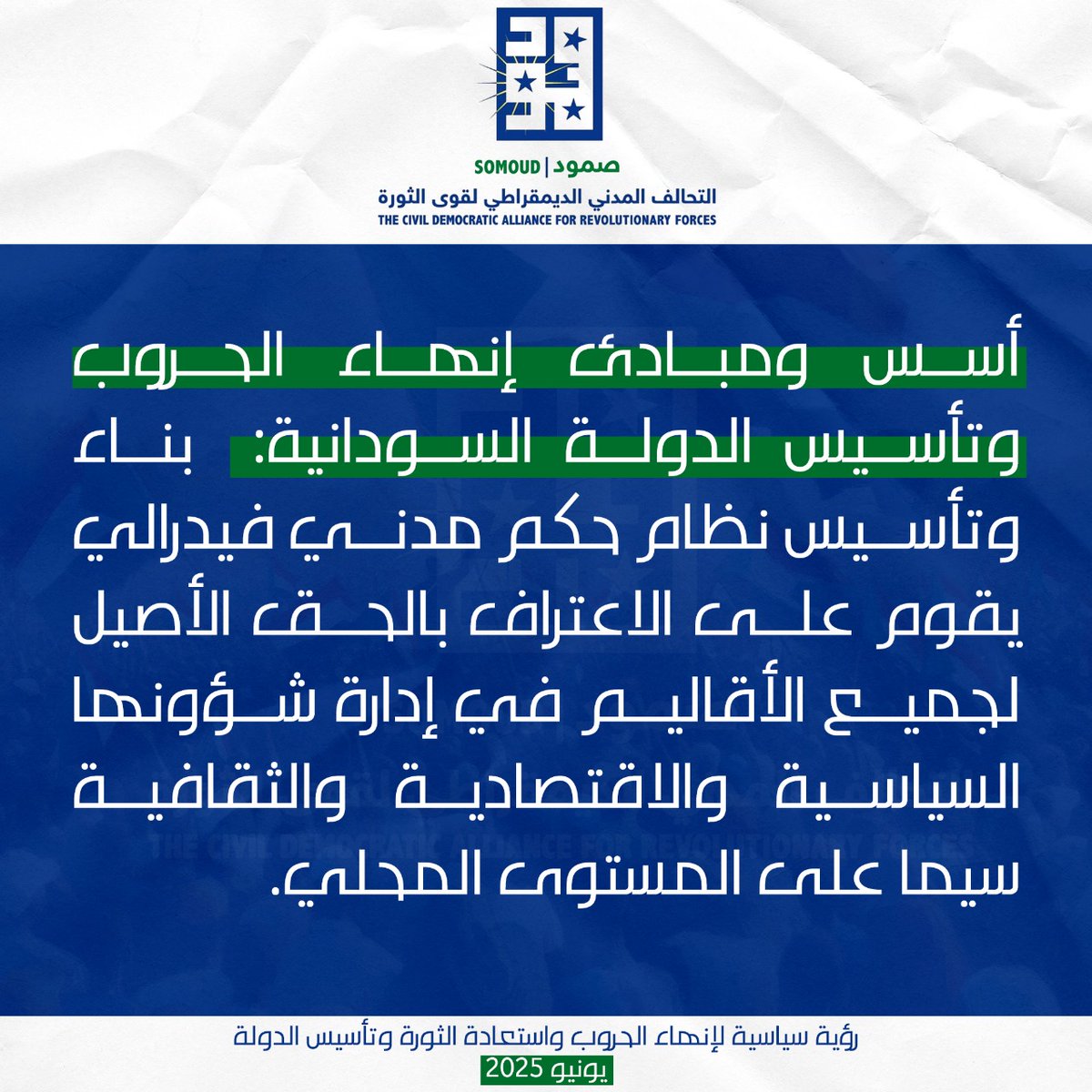 أسس ومبادئ إنهاء الحروب وتأسيس الدولة السودانية: بناء وتأسيس نظام حكم مدني فيدرالي يقوم على الاعتراف بالحق الأصيل لجميع الأقاليم في إدارة شؤونها السياسية والاقتصادية والثقافية سيما على المستوى المحلي.
