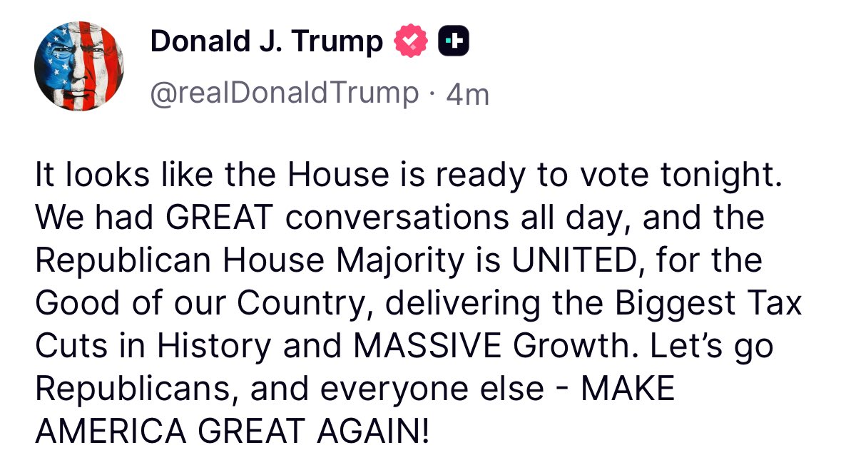 🚨 #ترامب يعلن عن توصل الجمهوريين إلى توافق للتصويت على مشروع الموازنة في مجلس النواب الليلة بعد محادثات استمرّت طوال اليوم، مضيفا” :”الأغلبية الجمهورية في مجلس النواب موحّدة من أجل مصلحة وطننا، لتقديم أكبر تخفيضات ضريبية في التاريخ ونمو اقتصادي هائل”
