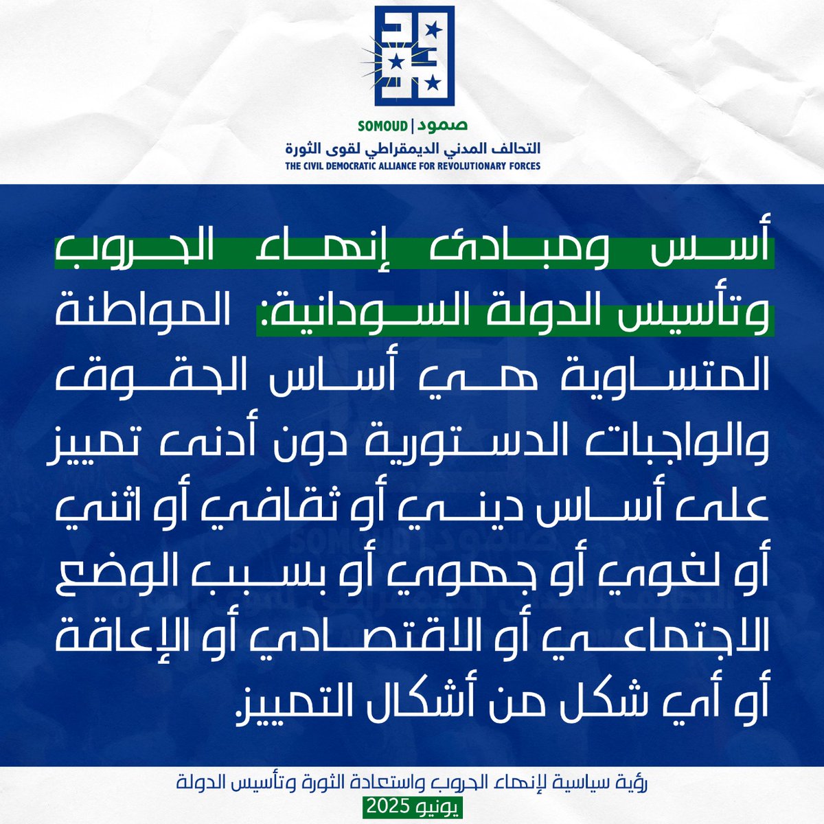 أسس ومبادئ إنهاء الحروب وتأسيس الدولة السودانية: المواطنة المتساوية هي أساس الحقوق والواجبات الدستورية دون أدنى تمييز على أساس ديني أو ثقافي أو اثني أو لغوي أو جهوي أو بسبب الوضع الاجتماعي أو الاقتصادي أو الإعاقة أو أي شكل من أشكال التمييز.
