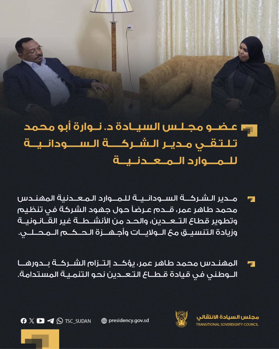 مجلس السيادة عضو مجلس السيادة د. نوارة أبو محمد تلتقي مدير الشركة السودانية للموارد المعدنية… By null Published August 12, 2025 Share SHARE Facebook Twitter Pinterest LinkedIn[ad_1] ⭕️ عضو مجلس السيادة د. نوارة أبو محمد تلتقي مدير الشركة السودانية للموارد المعدنية بورتسودان ١٩-٦-٢٠٢٥م [ad_2] Source by مجلس السيادة الإنتقالي – السودان Facebook Twitter Pinterest LinkedIn Share This Article Facebook Twitter Email Print Previous Article with relevant Sudanese government institutions and civil society to prevent sexu… Next Article الآن بث مباشر … Leave a Comment Leave a Reply Cancel replyYour email address will not be published. Required fields are marked *Comment * Name * Email * Website Save my name, email, and website in this browser for the next time I comment. Δ SearchSearchRecent Postsأكرمنا الله صباح اليوم الأحد بلقاء إخوةٍ كرام، على ضفة النيل الأزرق، حيث شاي الش… أعلن بنك السودان المركزي في منشور إدارة السياسات رقم (2025/15) رفع الاحتكار عن ا… ندوة بعنوان: القانون الدولي والسيادة الوطنية قراءة في موقف السودان من لجنة تقصي … والي نهر النيل تستقبل وزير الموارد البشرية والرعاية الاجتماعية الوزير يشيد بالأ… كامل ادريس: رئيس اللجنة السياسية لمؤسسات الدولة السودانية. Recent CommentsNo comments to show.