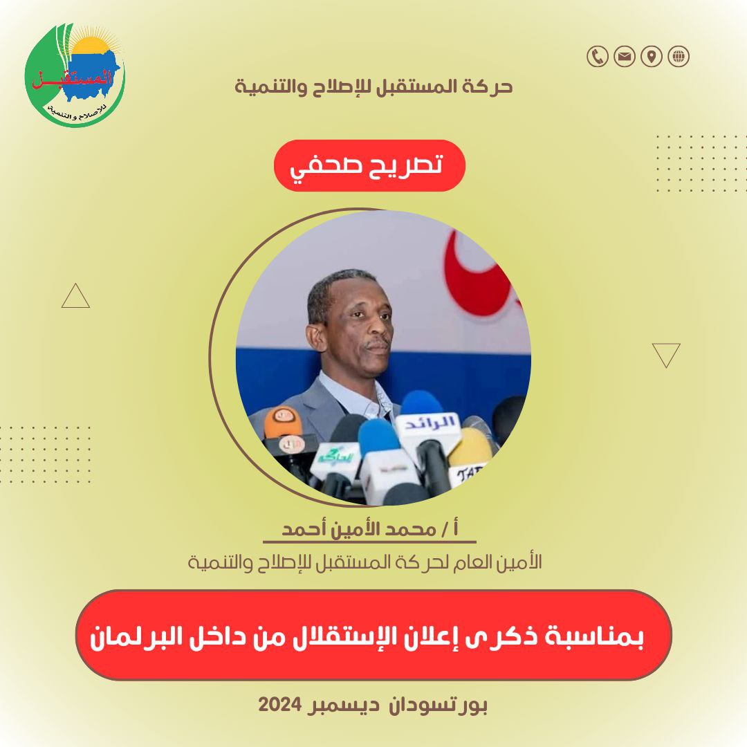 في ذكرى إعلان الاستقلال من داخل البرلمان نحيي الجيل الأول من السودانيين، الذين عملوا من أجل أن ينال السودان حريته و استقلاله، و أن يخرج من نير الاستعمار نحو نور الحرية، كما نحيي الأجيال الوطنية التي تعاقبت على حراسته و الحفاظ على عزته وكرامة إنسانه و سعت لذلك ما استطاعت و إن صاحبت المسيرة كثير من النواقص والأخطاء. نعترف بذلك ونقر.