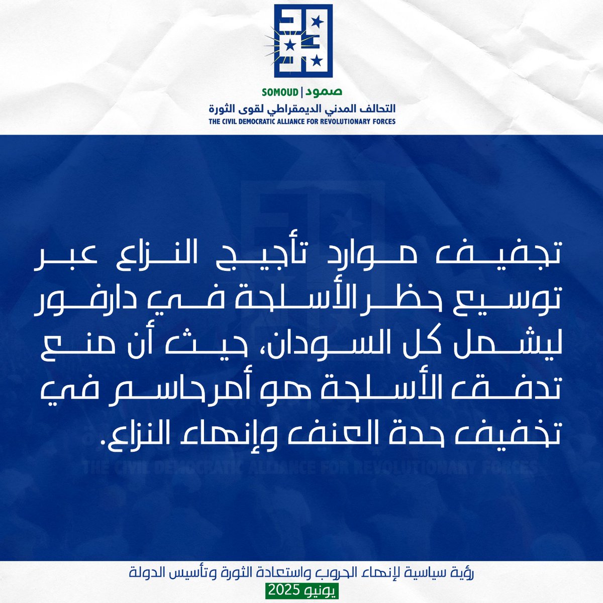 تحالف “صمود” : تجفيف موارد تأجيج النزاع عبر توسيع حظر الأسلحة في دارفور ليشمل كل السودان، حيث أن منع تدفق الأسلحة هو أمر حاسم في تخفيف حدة العنف وإنهاء النزاع.