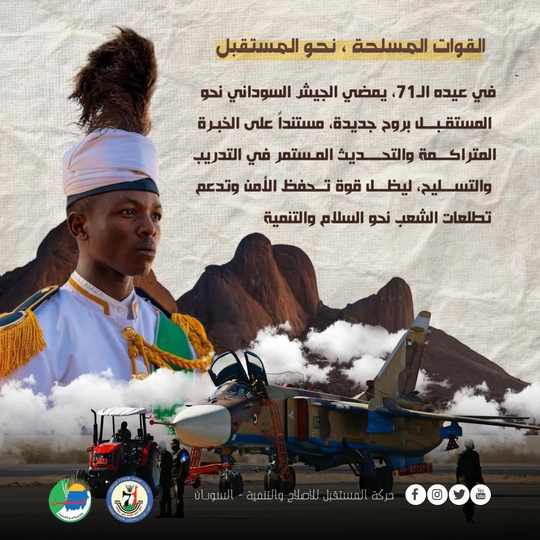 في هذا اليوم، نترحم على أرواح شهدائنا الأبرار من أبناء الجيش، ونُحيي جرحانا البواسل، ونعاهدهم أن نظل أوفياء لطريقهم، عاملين مع كل المخلصين من أجل سودان قوي بجيشه، متماسك بشعبه، حر بقراره.