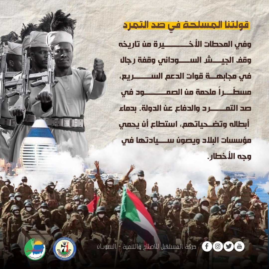 نحن في حركة المستقبل للإصلاح والتنمية نؤكد دعمنا الكامل لجيشنا الوطني، ونرفض أي وجود لقوة مسلحة خارج إطار الدولة، إيمانًا بأن القوات المسلحة هي العمود الفقري لبناء السودان المدني الموحد، دولة القانون والعدالة.