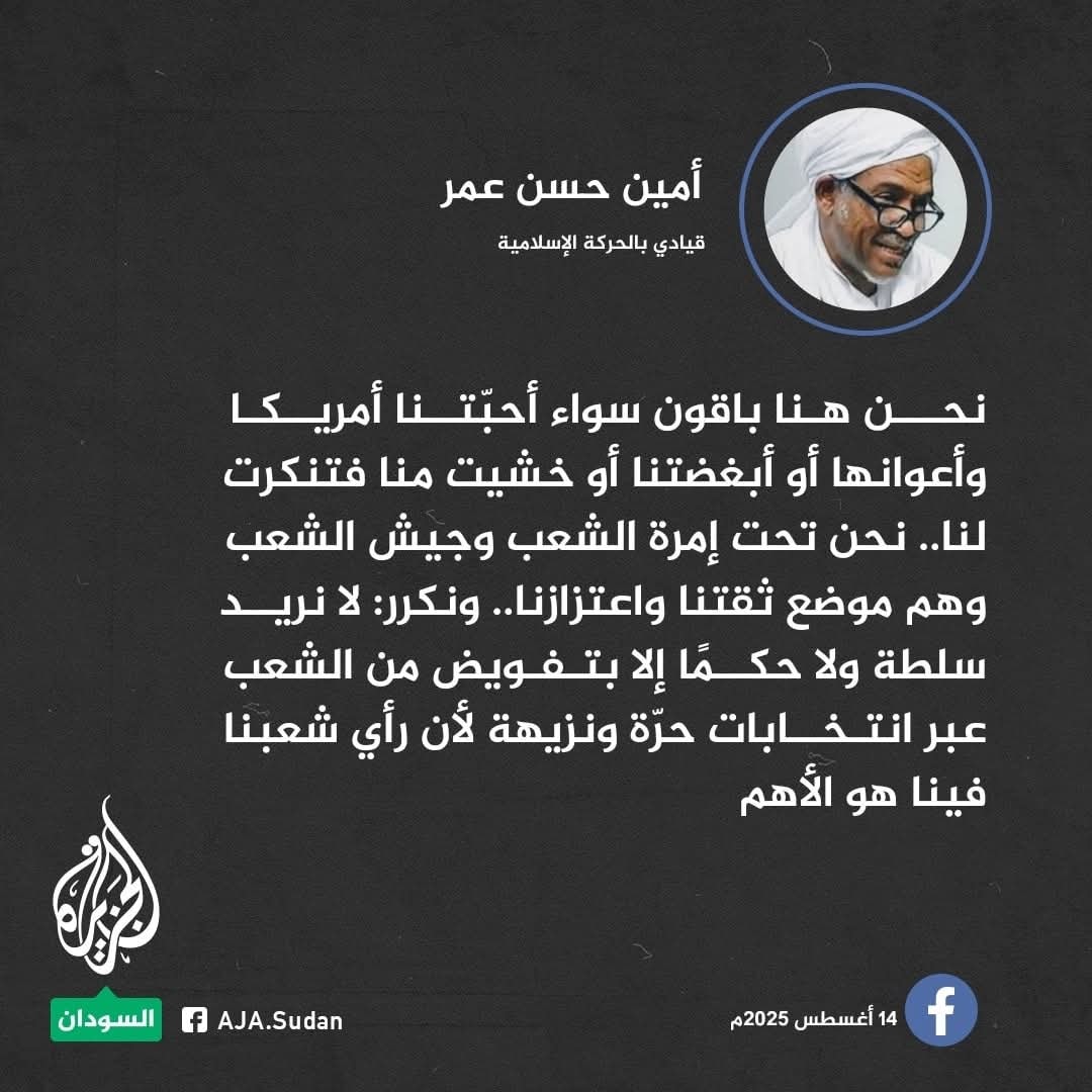 ■ أخي الشيخ الرمز أمين حسن عمر .. حتي لا ندفع جميعنا ثمناً غالياً لقراءة غير واقعية لقطع الأرض المتجاورات التي نقف عليها الآن .. ليتنا نتواضع قليلاً لنري حقاً وصدقاً أين نحن الآن .. وماهو كسبنا الحقيقي وكيف تنظر الأجيال الجديدة ليس إلي تجربتنا فقط وإنما إلي أفكارنا وتصورنا لحاضر ومستقبل بلادنا بأجيالها الجديدة المتوثبة ..