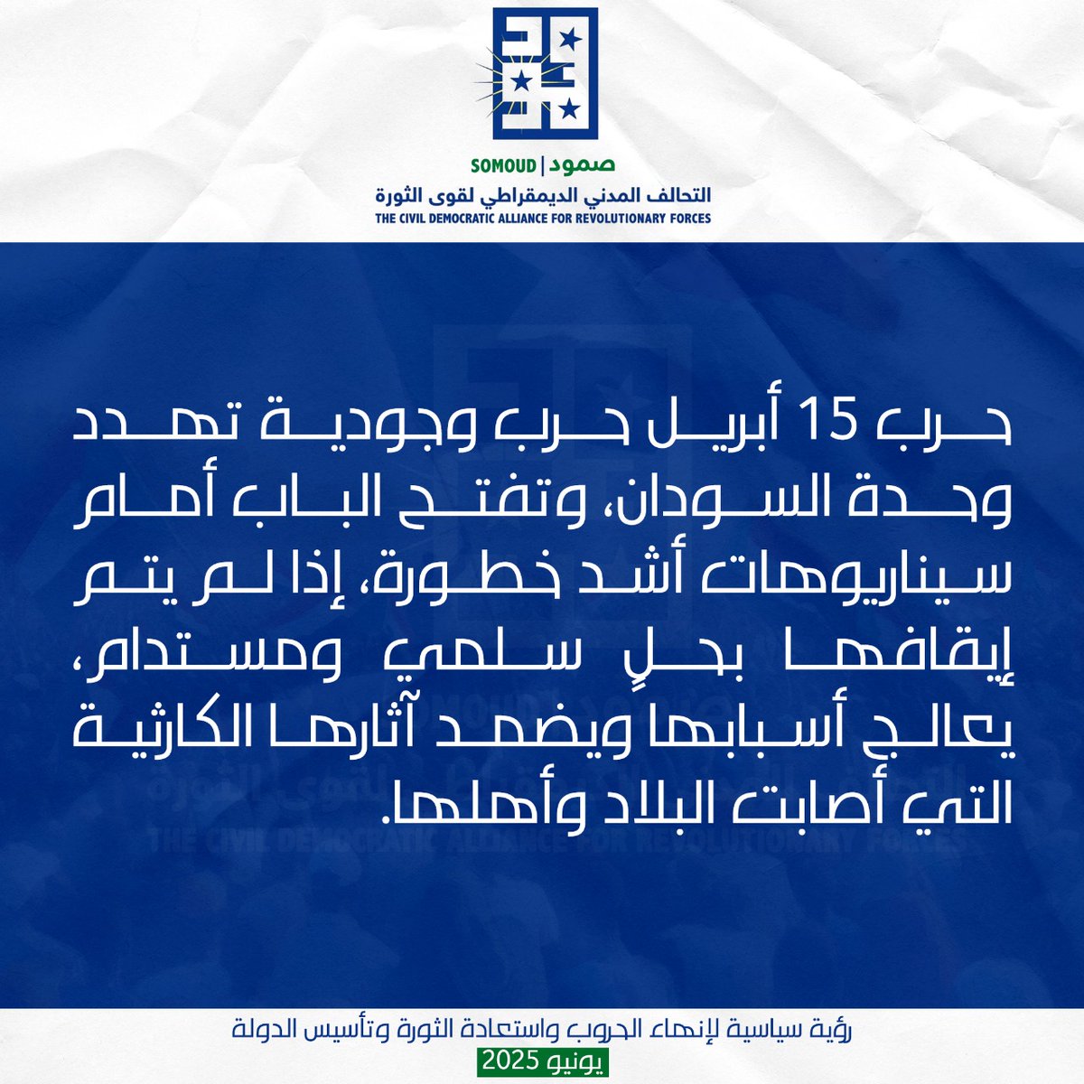 تحالف “صمود” : حرب 15 أبريل حرب وجودية تهدد وحدة السودان، وتفتح الباب أمام سيناريوهات أشد خطورة، إذا لم يتم إيقافها بحلٍ سلمي ومستدام، يعالج أسبابها ويضمد آثارها الكارثية التي أصابت البلاد وأهلها.