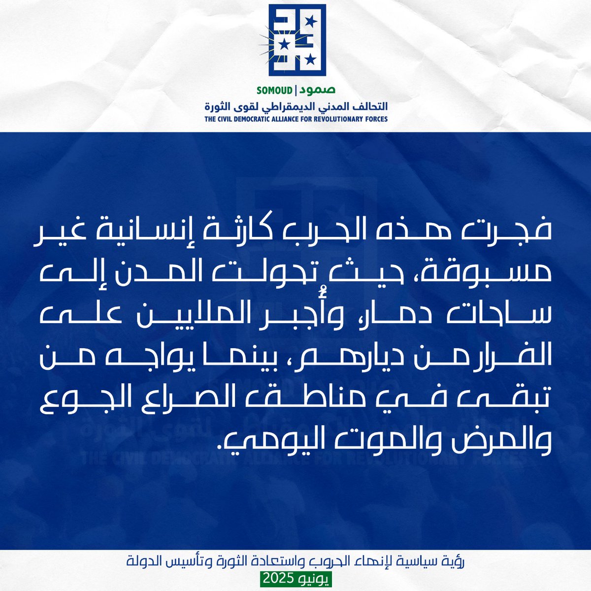 تحالف “صمود” : فجرت هذه الحرب كارثة إنسانية غير مسبوقة، حيث تحولت المدن إلى ساحا…