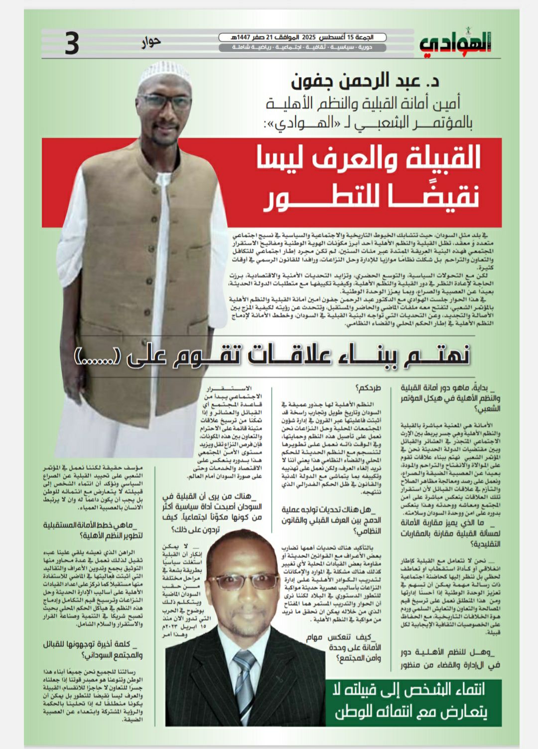 في هذا الحوار جلست الهوادي مع الدكتور عبد الرحمن جفون أمين أمانة القبلية والنظم الأهلية بالمؤتمر الشعبي، لتفتح معه ملفات الماضي والحاضر والمستقبل، وتتحدث عن رؤيته لكيفية المزج بين الأصالة والتجديد، وعن التحديات التي تواجه البنية القبلية في السودان، وخطط الأمانة لإدماج النظم الأهلية في إطار الحكم المحلي والقضاء النظامي.