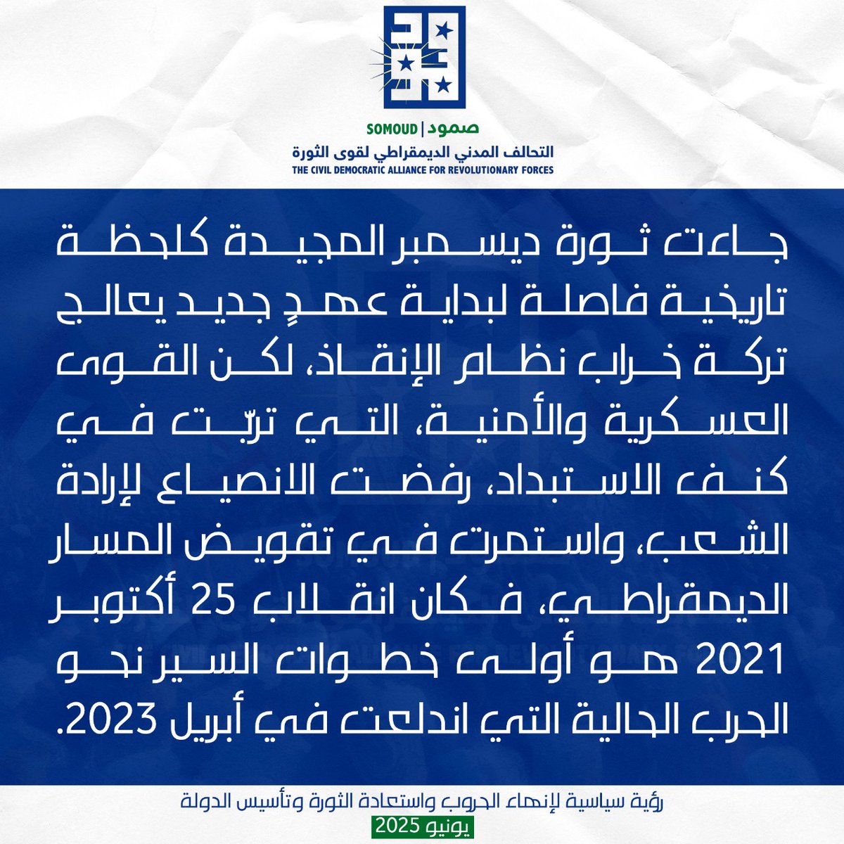 تحالف “صمود” : جاءت ثورة ديسمبر المجيدة كلحظة تاريخية فاصلة لبداية عهدٍ جديد يعالج تركة خراب نظام الإنقاذ، لكن القوى العسكرية والأمنية، التي تربّت في كنف الاستبداد، رفضت الانصياع لإرادة الشعب، واستمرت في تقويض المسار الديمقراطي، فكان انقلاب 25 أكتوبر 2021 هو أولى خطوات السير نحو الحرب الحالية التي اندلعت في أبريل 2023.