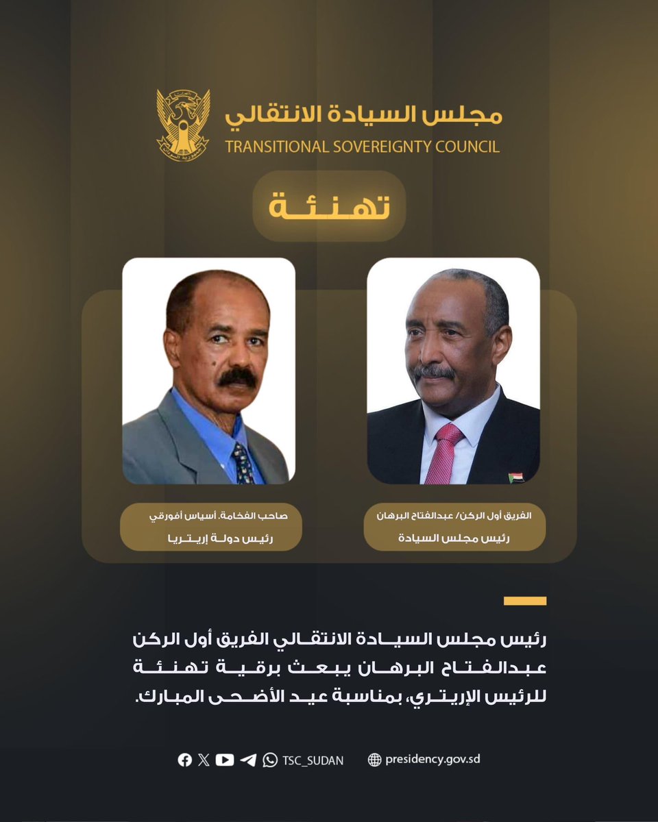 ⭕️ رئيس مجلس السيادة الانتقالي الفريق أول الركن #عبدالفتاح_البرهان يبعث برقية تهنئة لصاحب الفخامة #أسياس_أفورقي رئيس دولة أرتريا، بمناسبة عيد الأضحى المبارك.