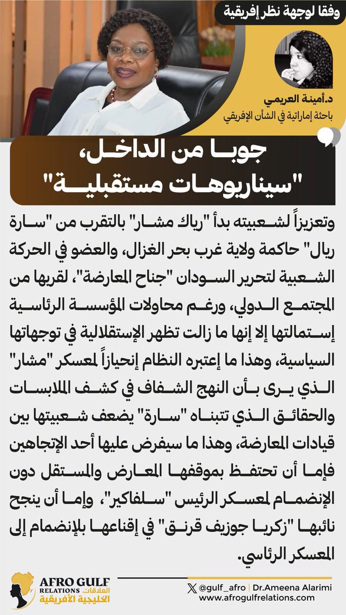 5️⃣ يجد معسكر “رياك مشار” صعوبة نسبيه في كسب الشخصيات السياسية أمثال “سارة ريال”، وبدأ المقربين من “مشار” يفسرونها بأنها عوائق حقيقية إذا لم يتم احتواءها فستتحول إلى أوراق رابحة في يد المعسكر الرئاسي وهذا ما يخشاه معسكر “رياك”، إلا أن ما يعيق إنضمام سارة إلى المعارضة هو ضعف شعبيتها بين قيادات المعارضة وذلك بسبب نهجها الشفاف في كشف الملابسات والحقائق، ونادي “أدم نارو” أحد القيادات في الحركة الشعبية المقربين من “مشار” إلى إستبدالها، وهذا ما أراه أنه سيفرض على “سارة” أحد الإتجاهين فإما أن تحتفظ سارة بموقفها المعارض والمستقل دون الإنضمام لمعسكر الرئيس “سلفاكير”، وإما أن ينجح نائبها “زكريا جوزيف قرنق” في إقناعها بلإنضمام إلى المعسكر الرئاسي.